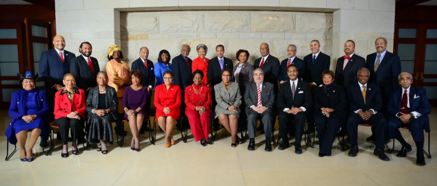 The 13 founding members of the American CBC in the early 1970s. Standing L–R: Parren Mitchell (MD), Charles B. Rangel (NY), Bill Clay, Sr. (MO), Ron Dellums (CA),George Collins (IL), Louis Stokes (OH), Ralph Metcalfe (IL), John Conyers (MI), and Walter Fauntroy(DC). Seated L–R: Robert Nix, Sr. (PA), Charles Diggs(MI), Shirley Chisholm (NY), and Gus Hawkins (CA).